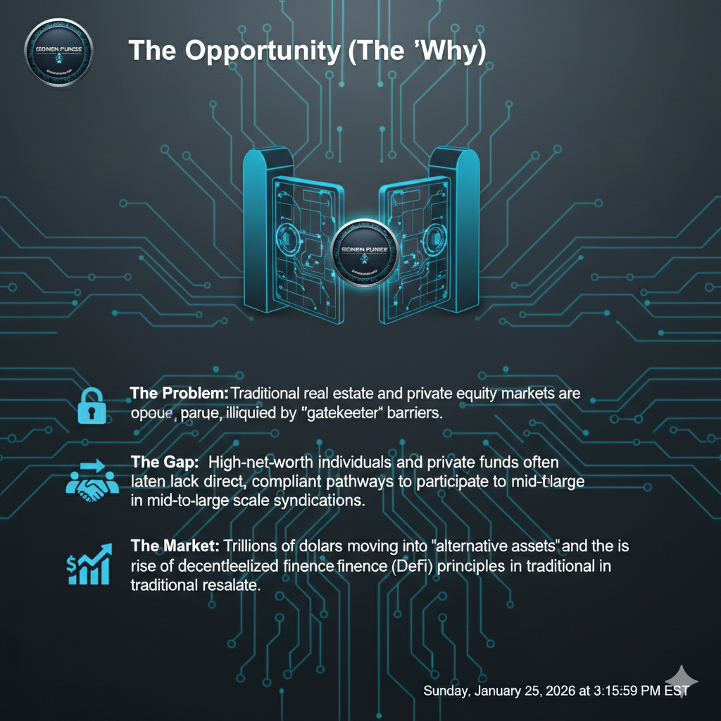 • The Problem: Traditional real estate and private equity markets are opaque, illiquid, and restricted by “gatekeeper” barriers.