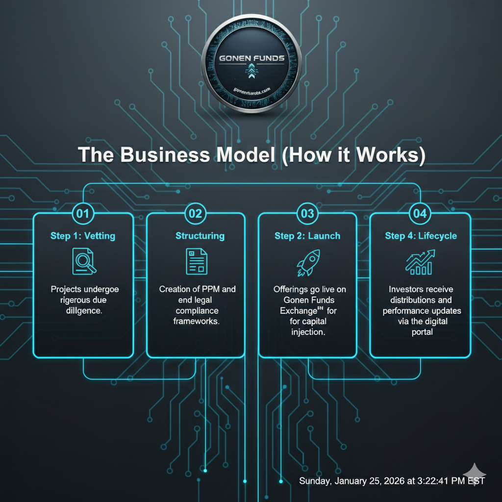 • Step 3: Launch. Offerings go live on the Gonen Funds Exchange™ for capital injection.